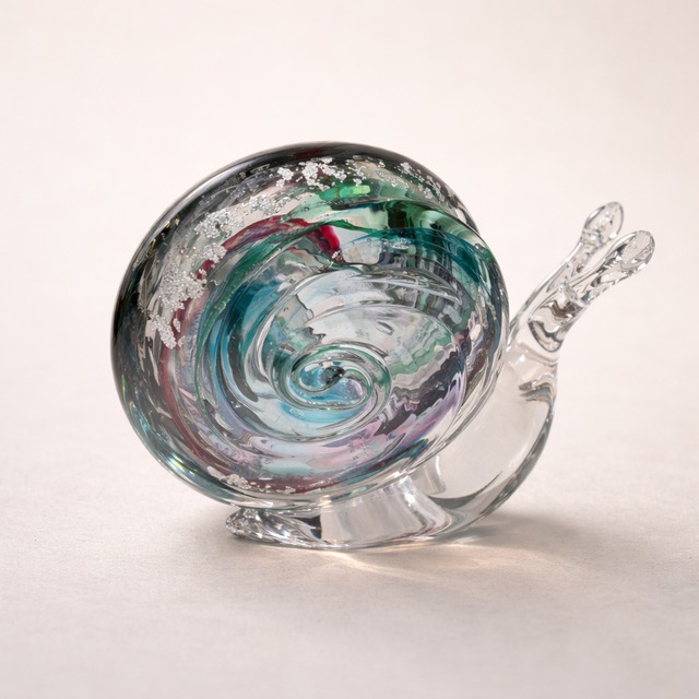 夏の夜、遠くから太鼓の音が聞こえてくるころ。 空に大きな花が咲いて、 また消えて、 人々の顔が赤く、青く、金色に染まります。 その一瞬を、ガラスの螺旋に閉じ込めました。 赤、青、金、銀—— いくつもの色が渦を巻いて、 どこから見ても違う表情を見せてくれます。 手のひらのなかに、夏祭りの夜が ひとつ、宿っているようです。 --- ガラスのかたつむり 祭花 サイズ:約 8 × 2.5 × 高さ 5.5 cm 重量:約 250 g 材質:ガラス 原産地:日本 --- ガラスかたつむりの他の器はこちら https://tsunetanaka.thebase.in/search?q=かたつむり ---