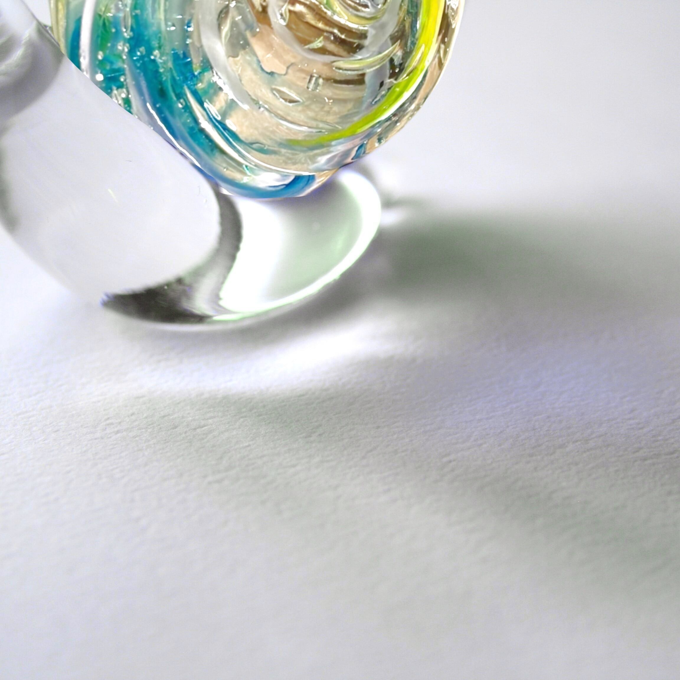 そっと雨上がりの水たまりを覗き込んだとき、ふわりと現れる虹の色。その一瞬の美しさをカタツムリのガラスオブジェに閉じ込めました。
