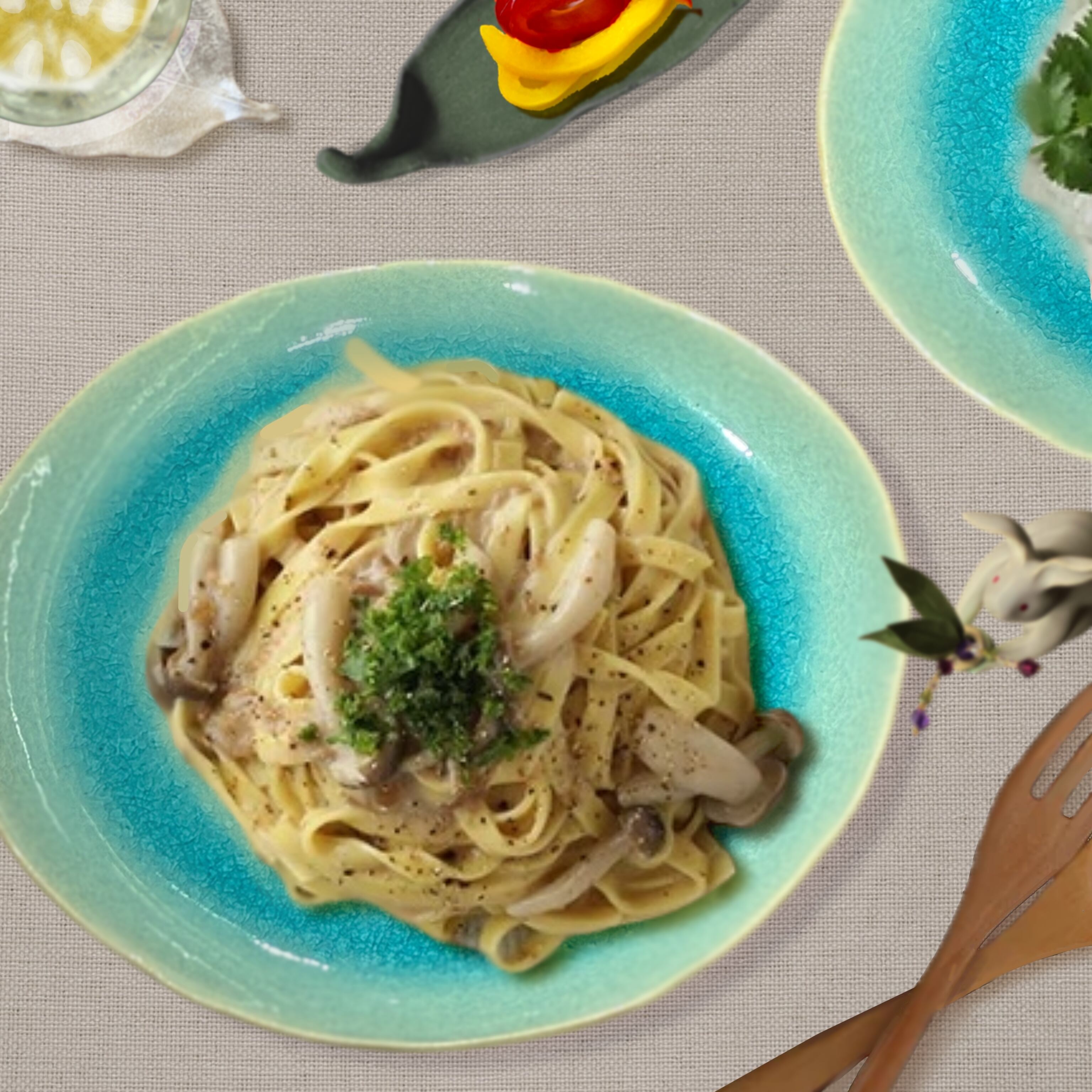 淡いブルーが料理の色を引き立て、食卓に静かな華やかさを添えてくれます。