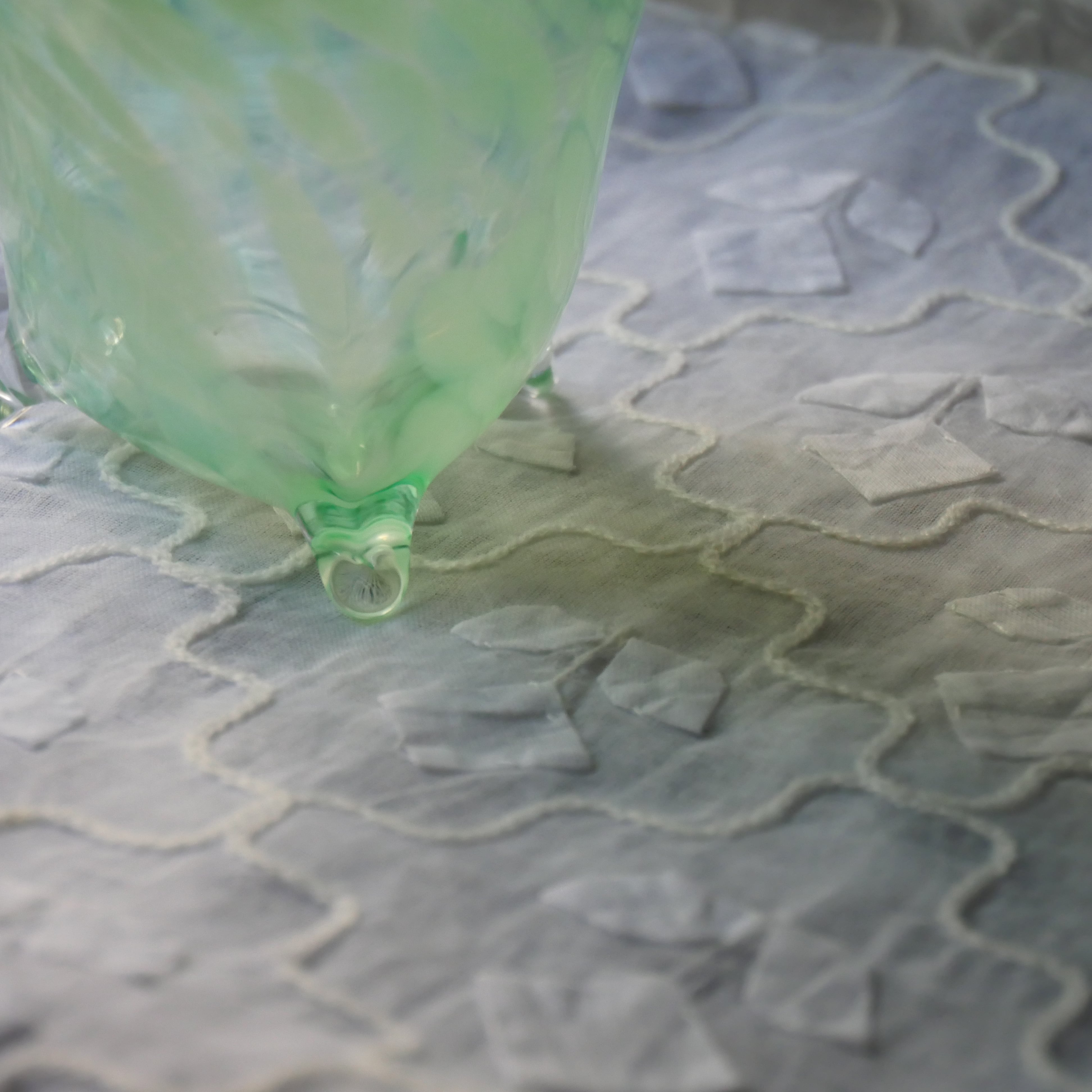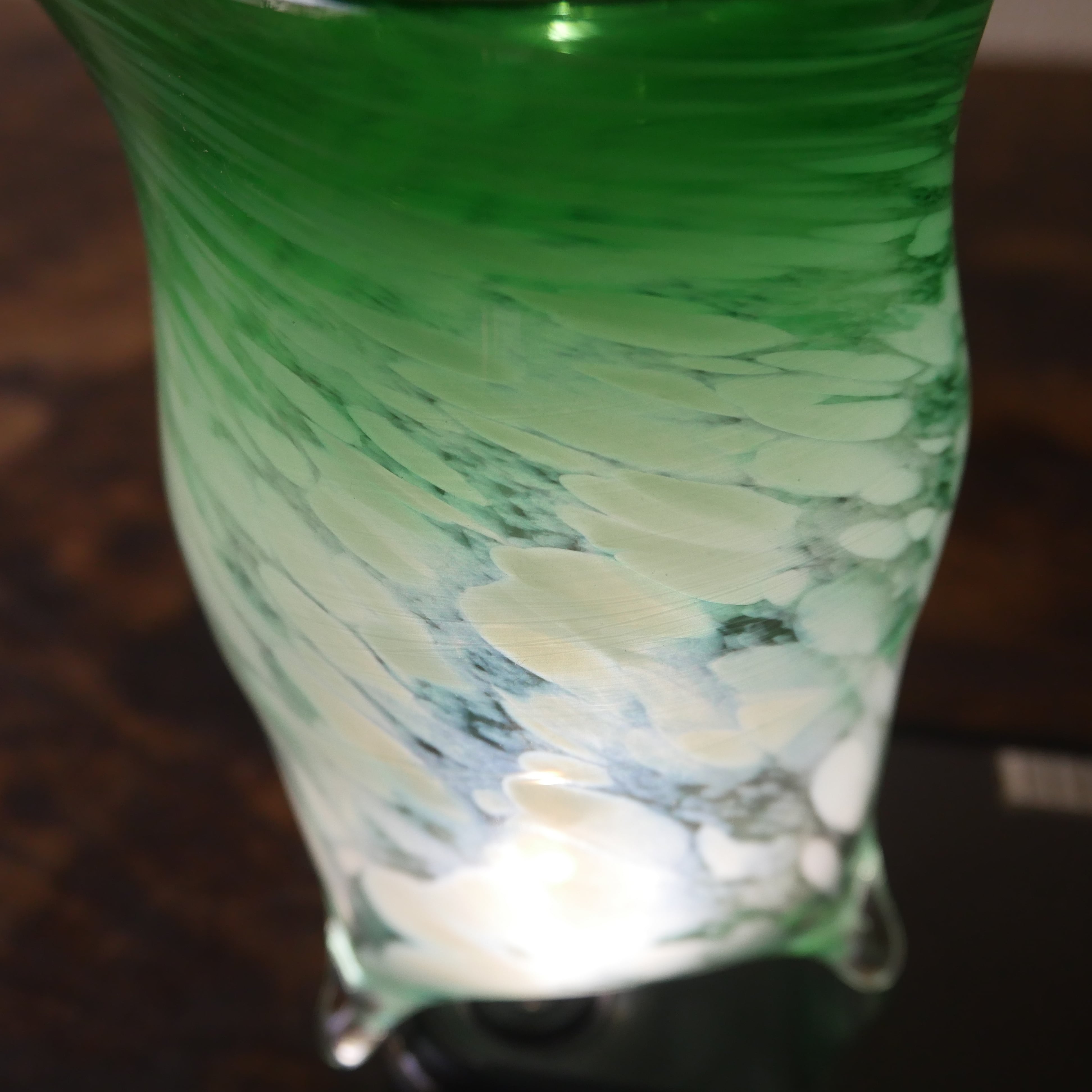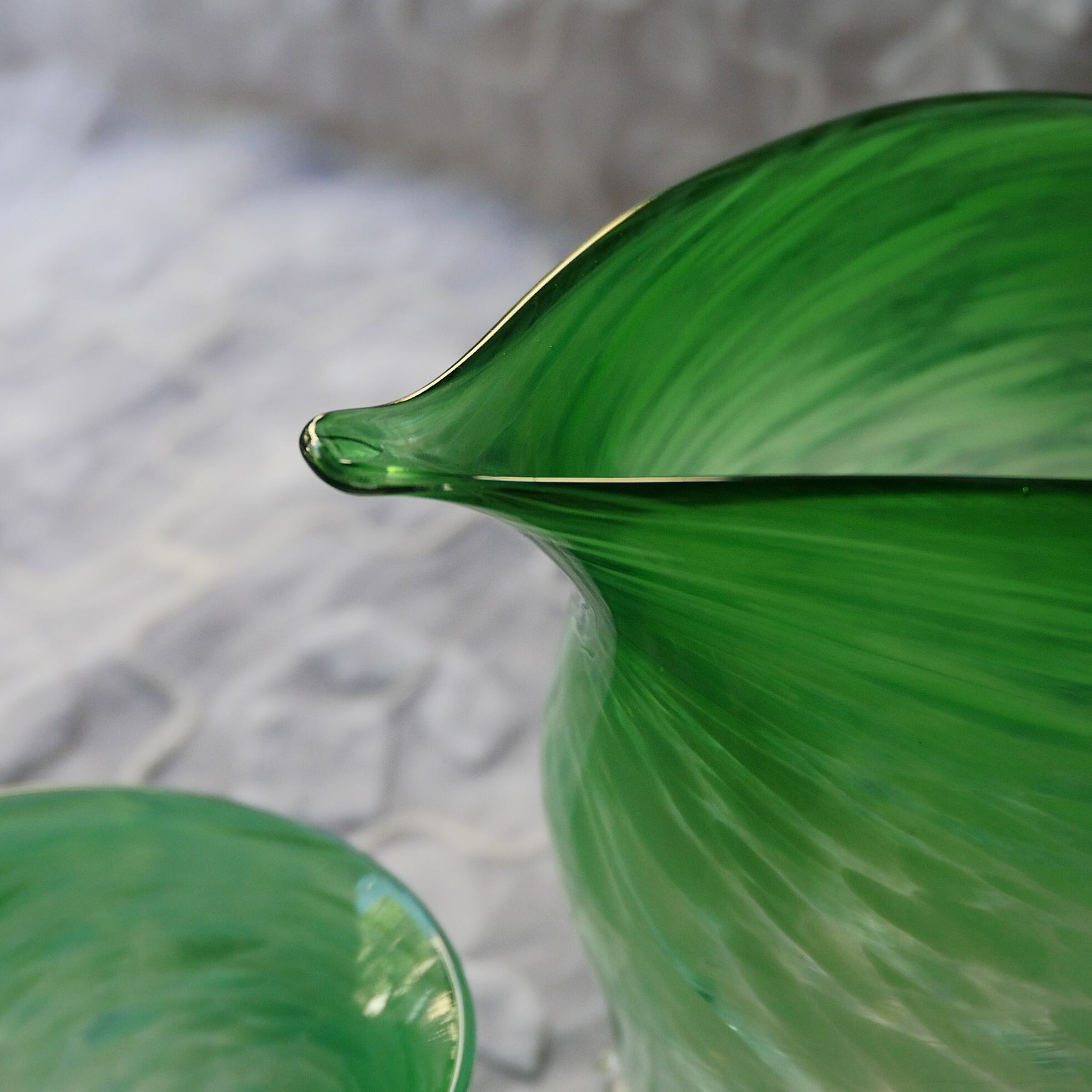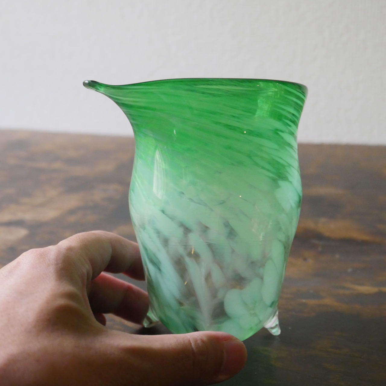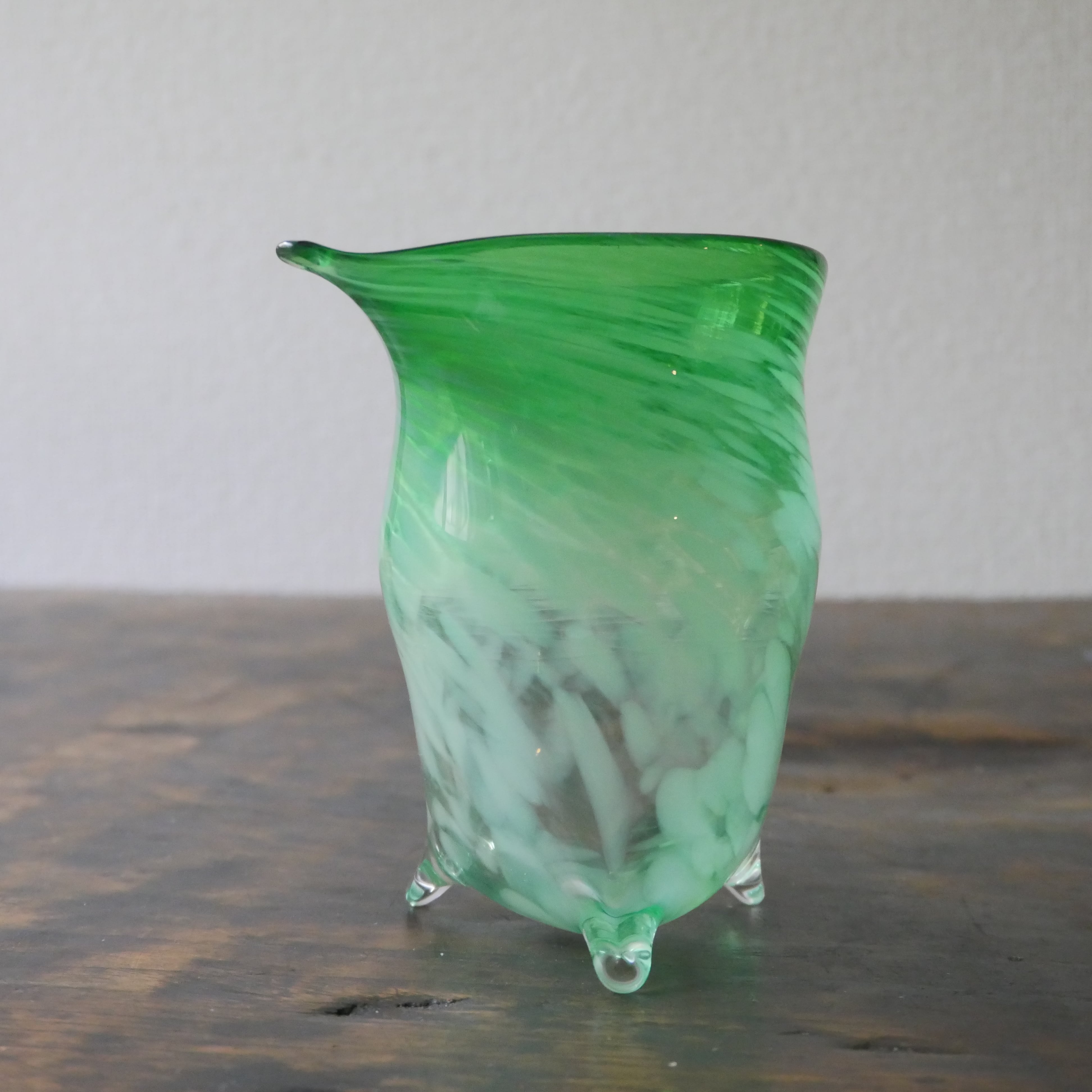 みずみずしい緑のグラデーションをまとった、ガラスの片口です。