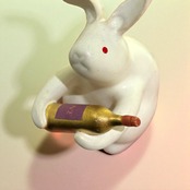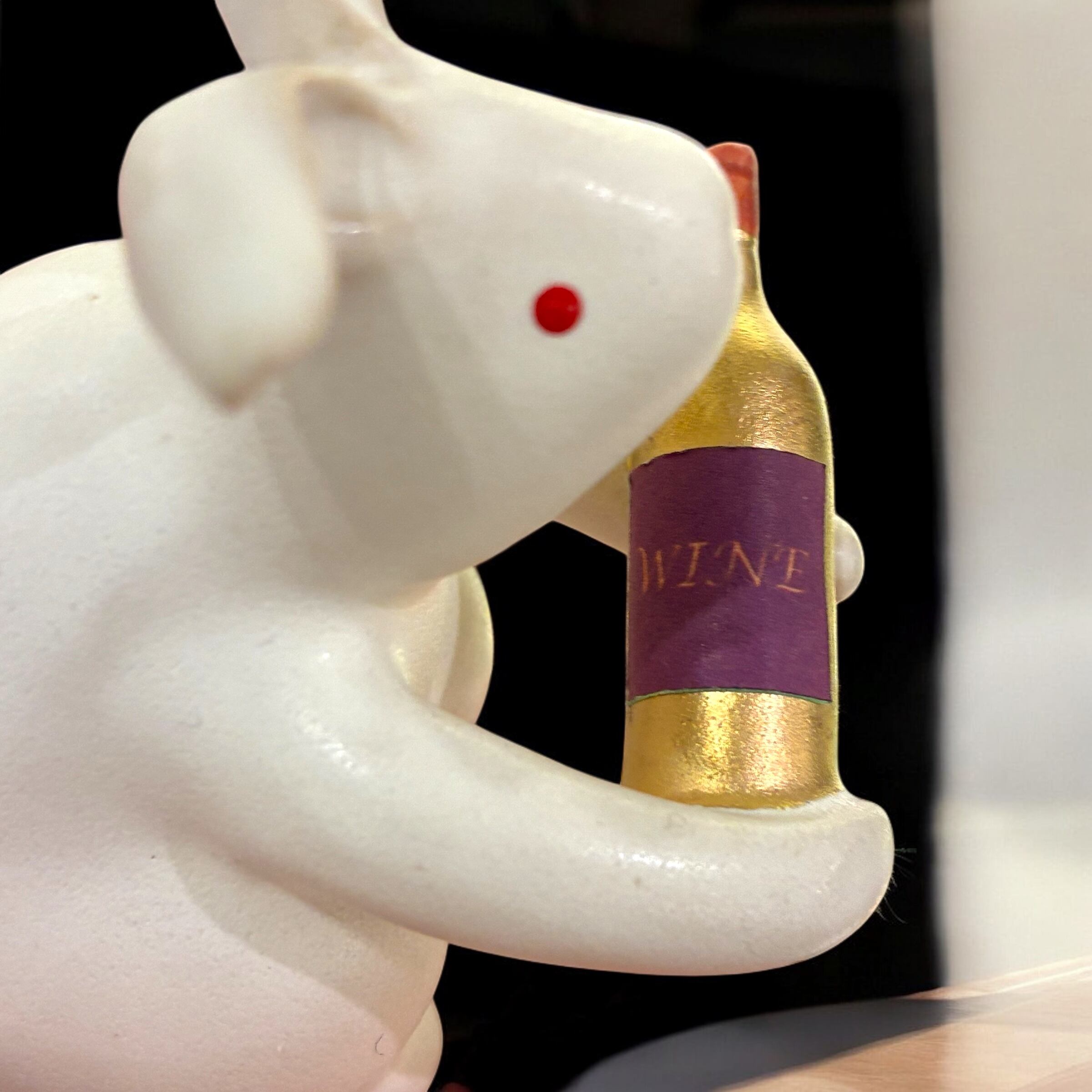 金のワインボトルを両手で抱え、静かにお酌をするうさぎ。