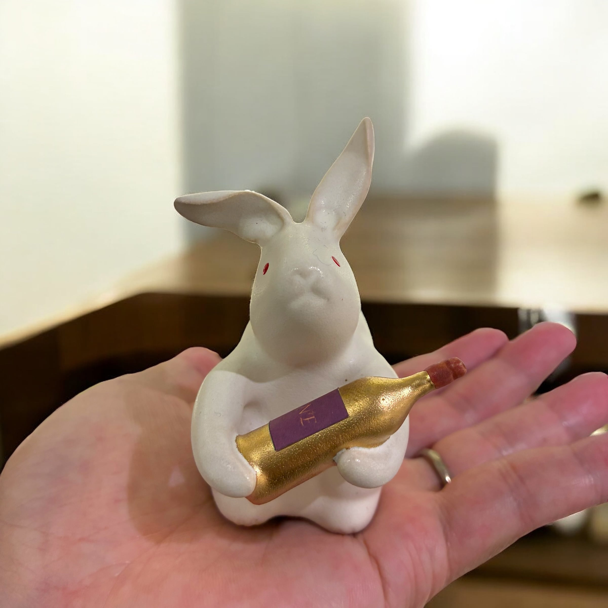 光を受けて柔らかく輝くボトルの金色と、うさぎの白磁の対比が美しく、季節のしつらえにもそっと華を添えてくれます。