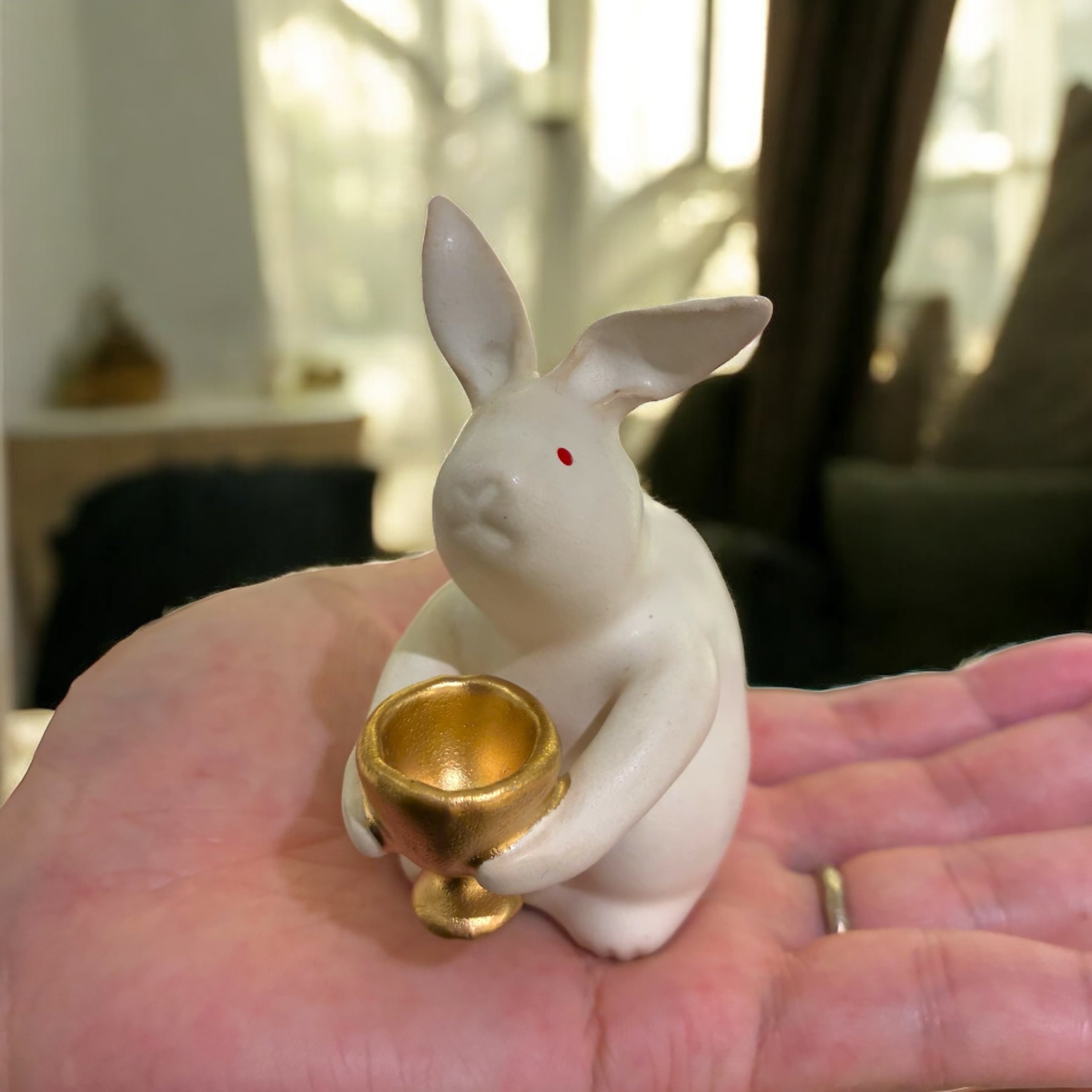 うさぎが手のひらで大切に抱えているのは、やわらかな金の輝きを放つ小さなワインカップ。
