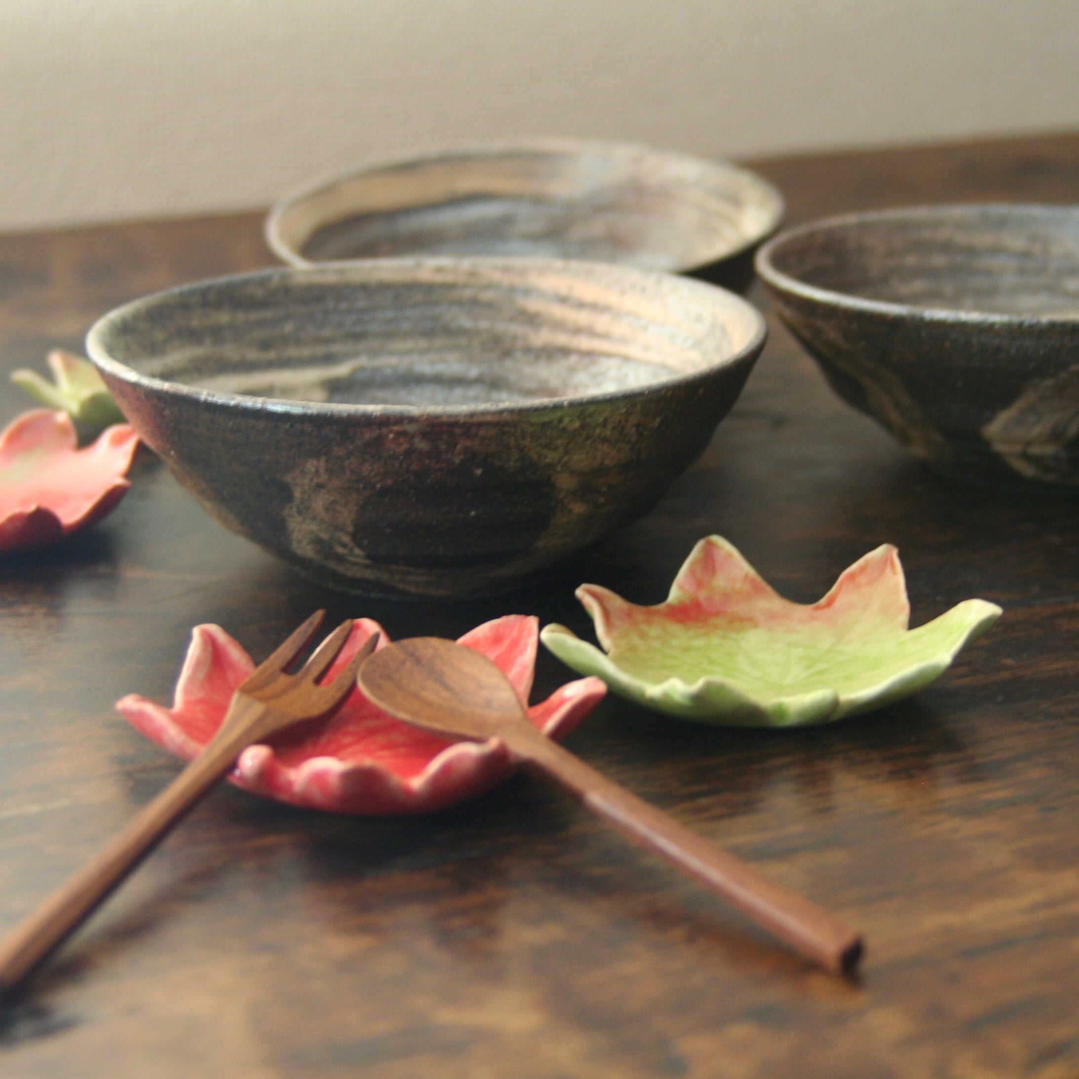 また葉っぱのシリーズは、釉薬をわざと鉄目(黒い点)が出やすい調合に。
