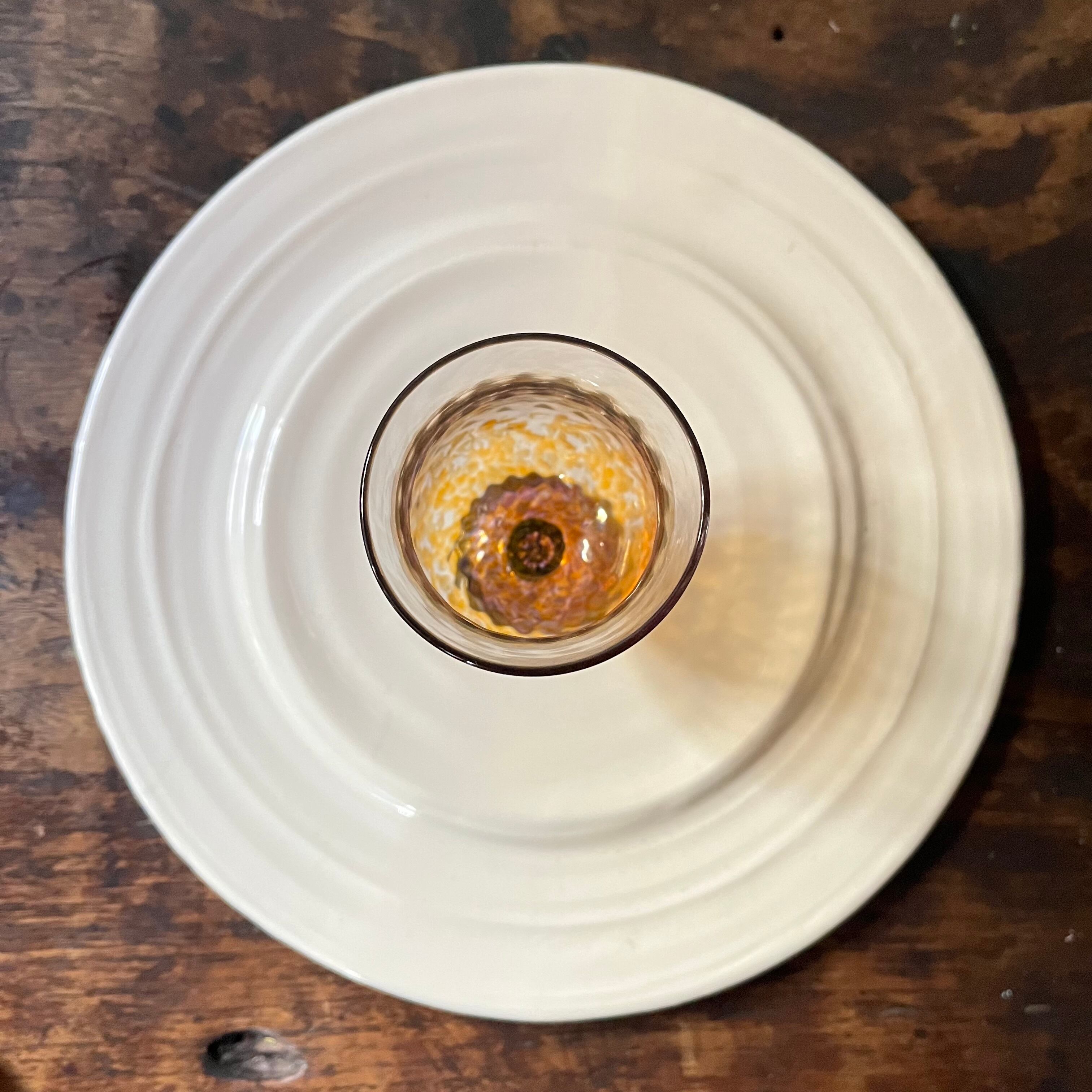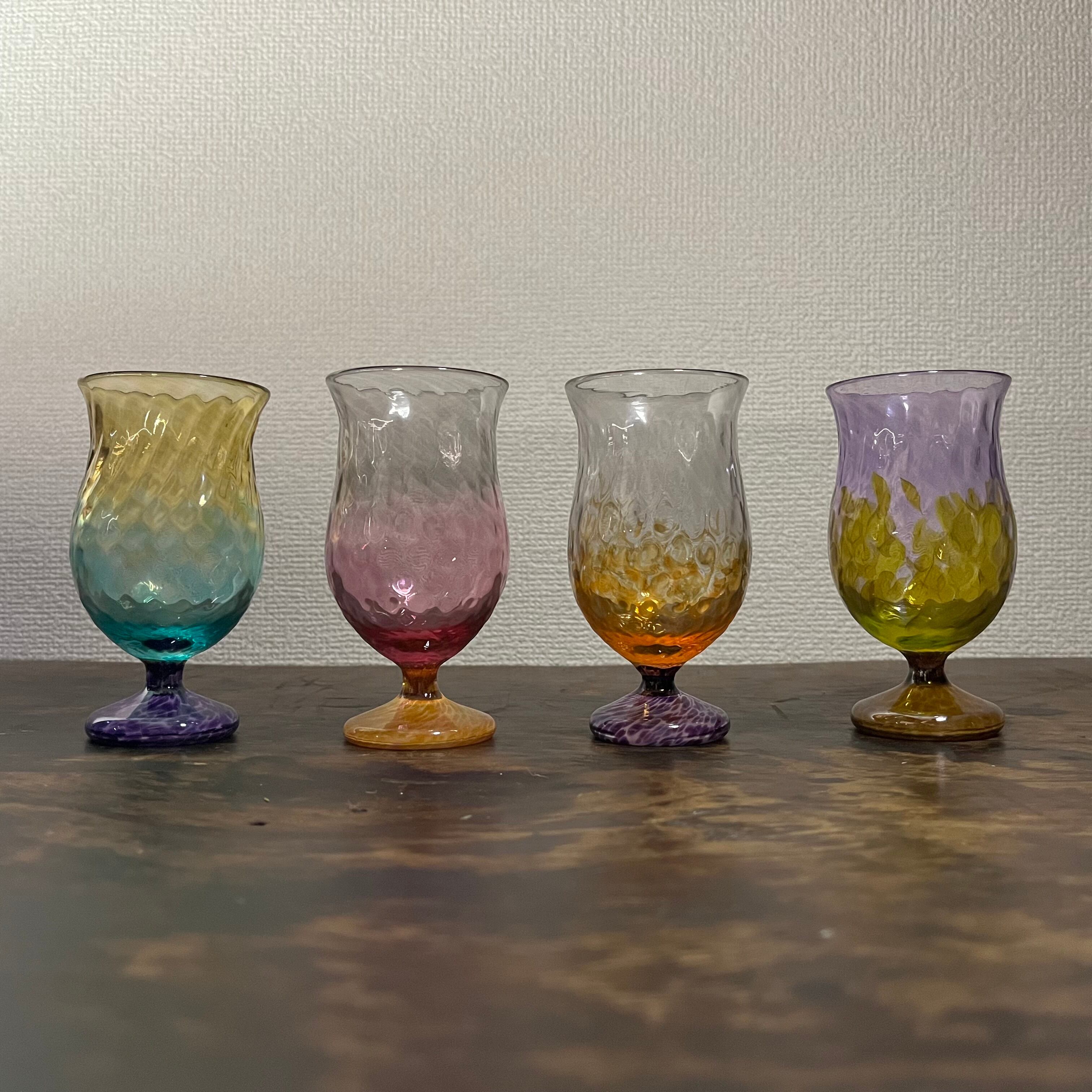 複雑な色が重なり合う、神秘的なその一瞬の色を、吹きガラスでグラスにいたしました。