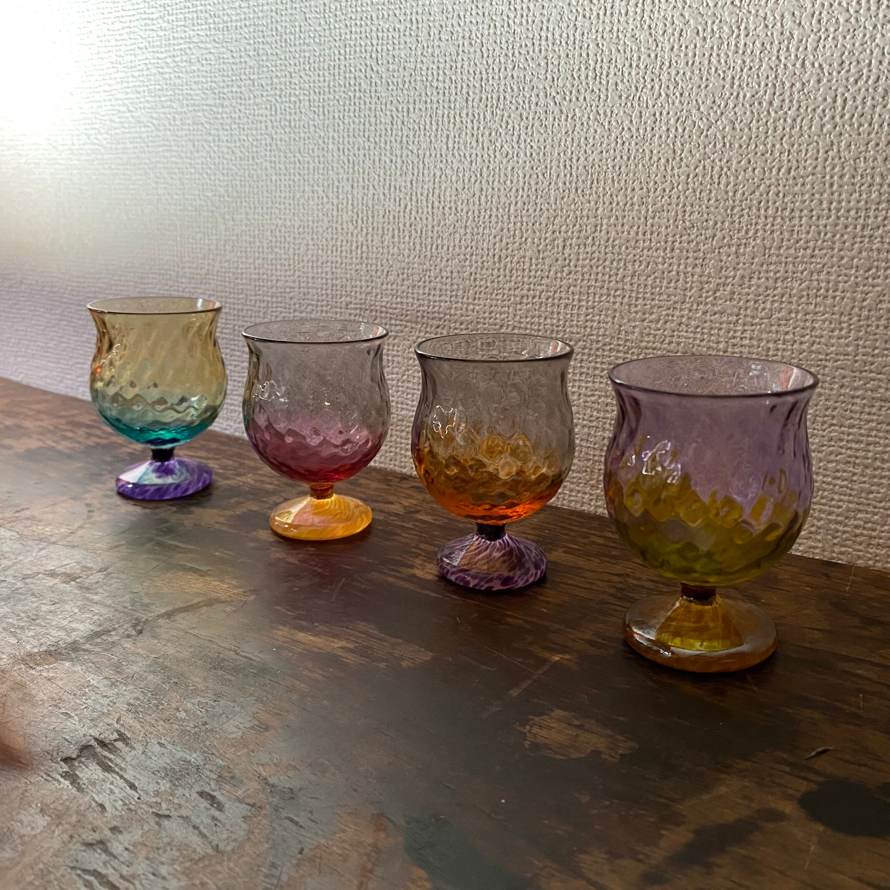 複雑な色が重なり合う、神秘的なその一瞬の色を、吹きガラスでグラスにいたしました。