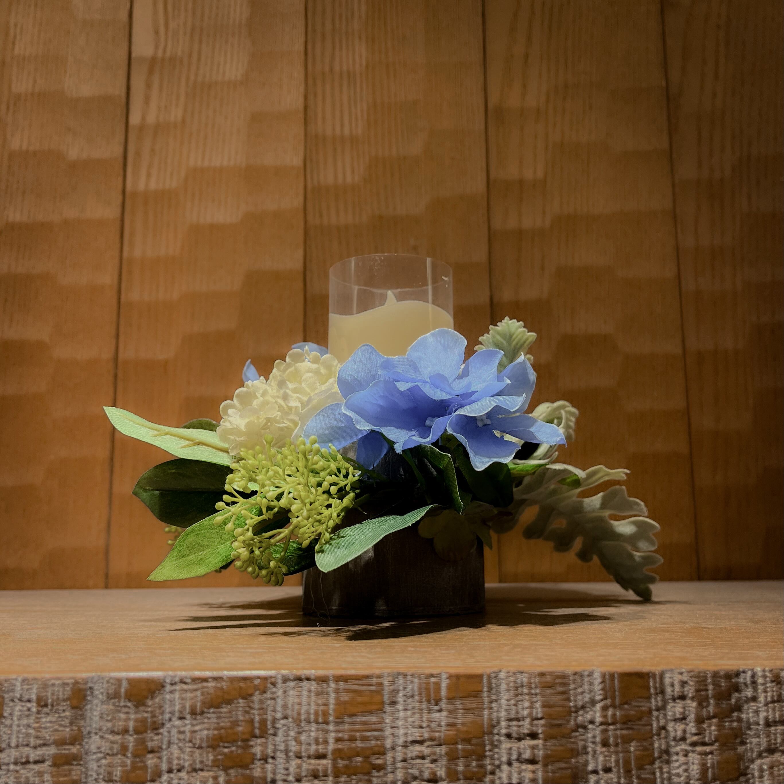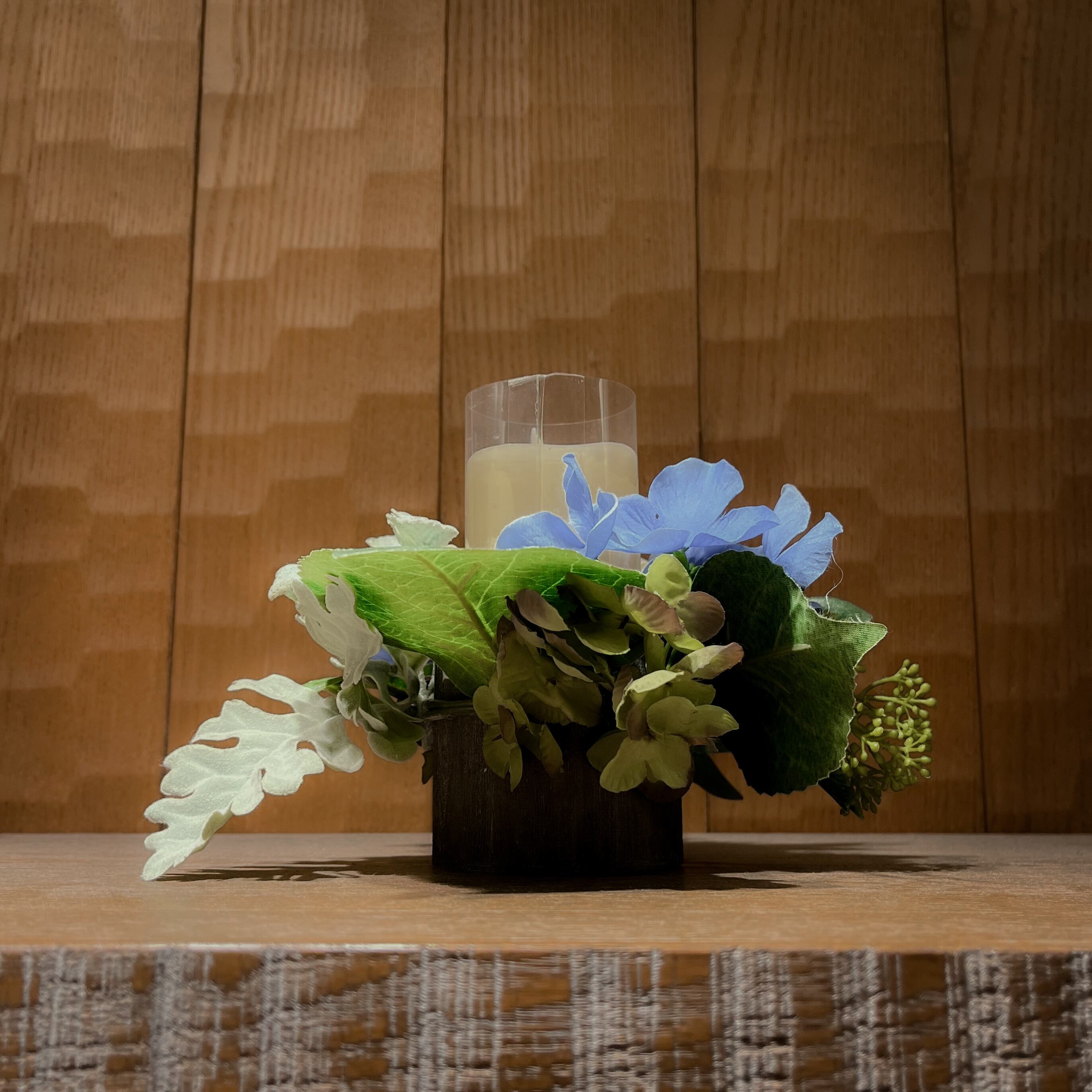 造花の紫陽花やその他葉っぱ、LEDキャンドルを組み合わせ、置くだけでしっかり雰囲気を作ってくれるお飾りを作りました。