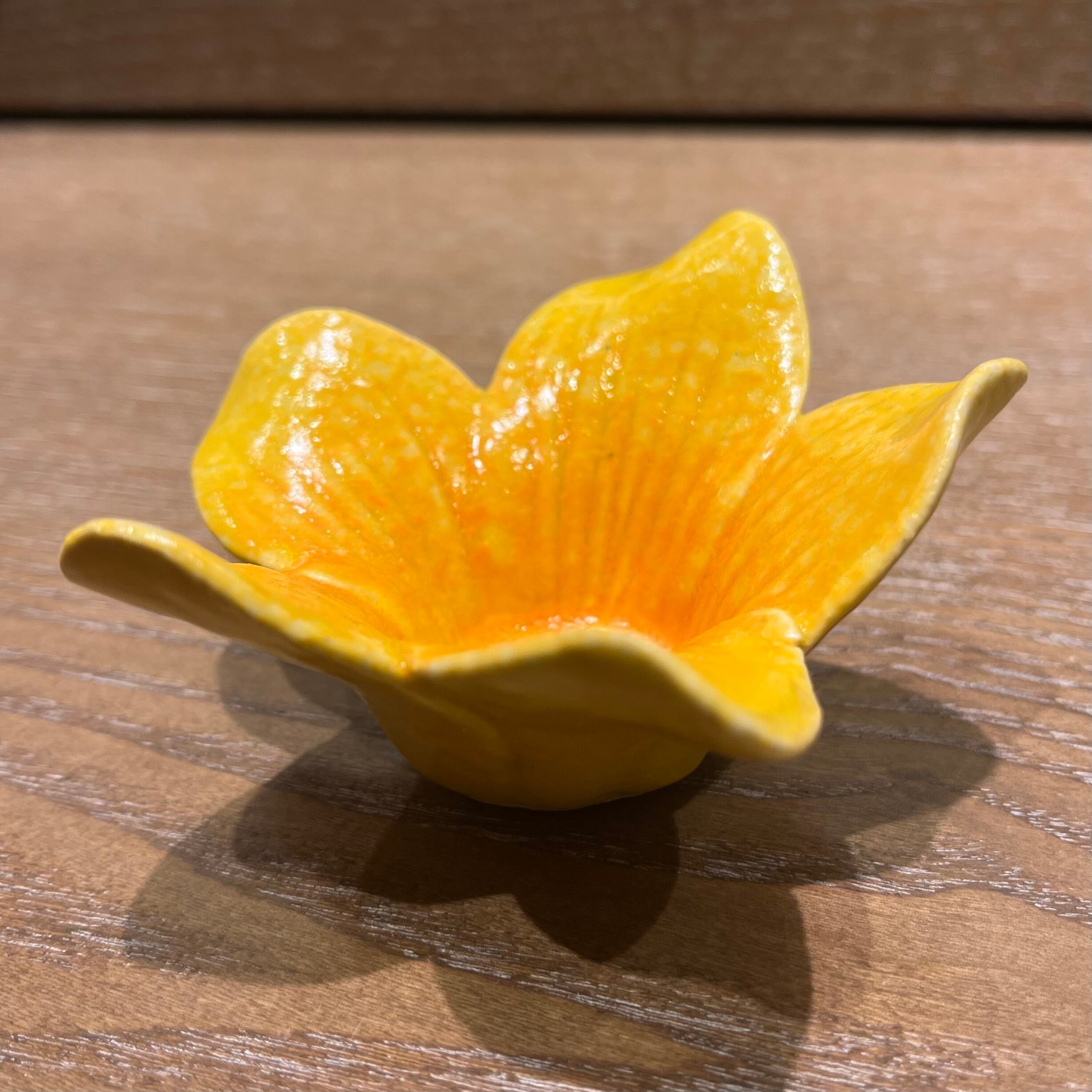 春を告げる花として親しまれるレンギョウをモチーフにしたデザインです。繊細な花びらの形状を再現し、柔らかな色合いで仕上げたこの小鉢は、テーブルに春らしい彩りを添えます。