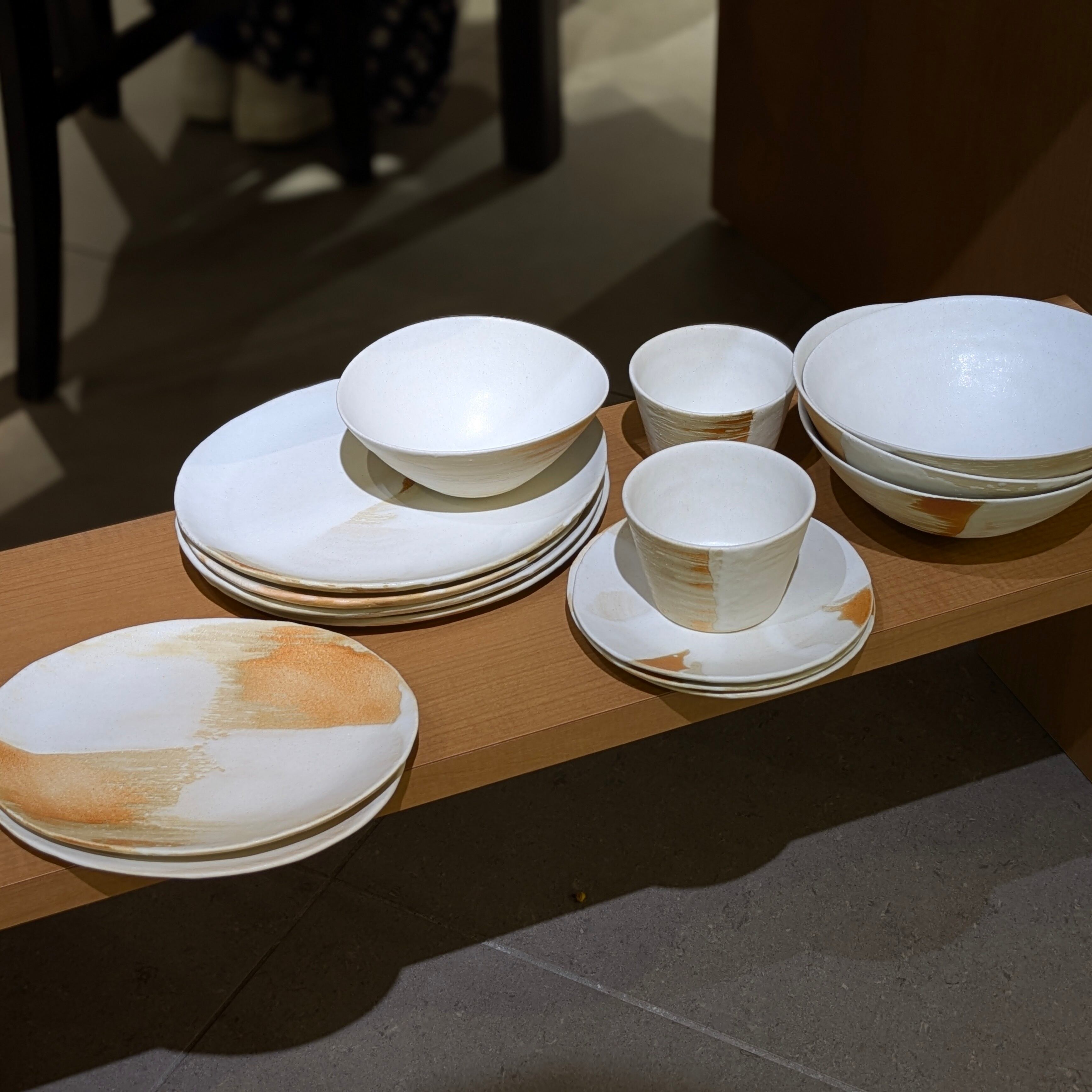 「白々(しろじろ)」シリーズは、釉薬を刷毛で塗り分け、何層にも重ねることで奥行きのある風合いを生み出しています。白と茶の釉薬が重なり合うことで、単なる“白”ではない、深みのある独特の質感が生まれます。